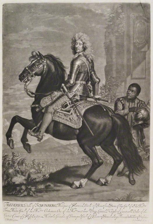 As a result of the Inniskillings’s success on 25 September, Marshal Schomberg, commanding King William’s Army in Ireland encamped at Dundalk, and on their return ‘complimented them so far as to ride all along their line with his hat off ‘.