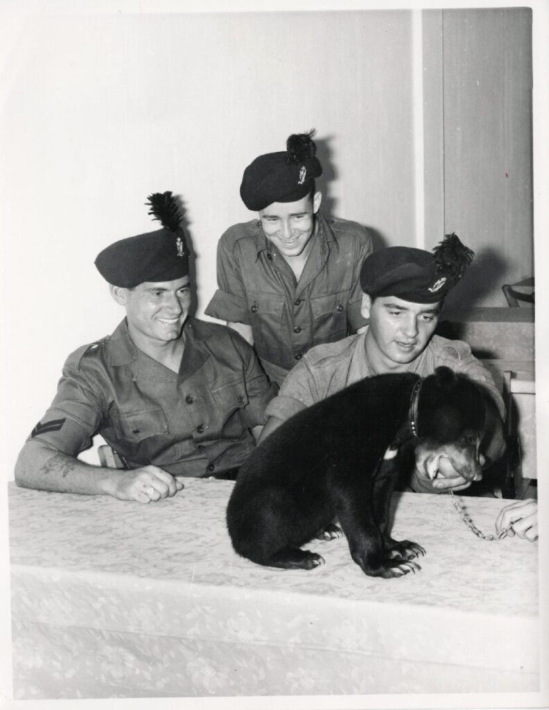 Another beloved pet was Stickie the Bear. She was found wandering around camp when The Royal Ulster Rifles were stationed in Borneo during the Indonesia-Malaysia Confrontation. The little black Malayan sun bear was orphaned and looking for a new home.